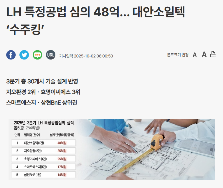 원문 링크 : LH 특정공법 심의 48억… 대안소일텍 ‘수주킹’ - 대한경제?
