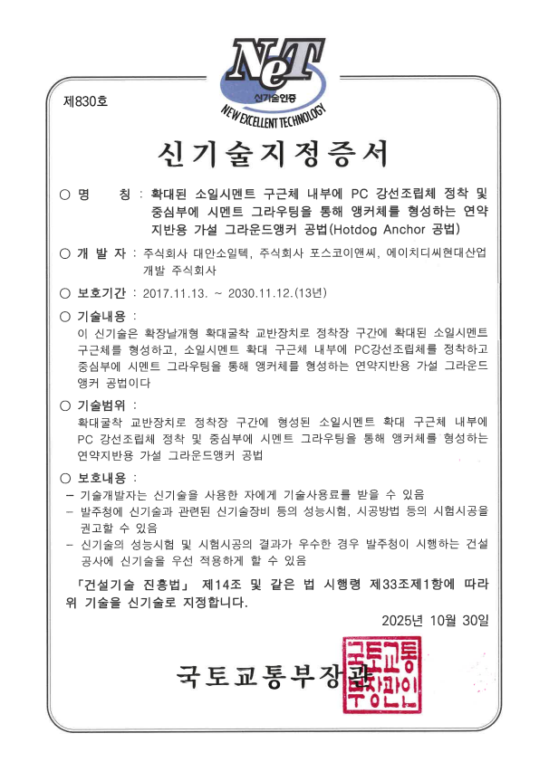 핫도그앵커공법, 건설신기술 제830호 지정(연장)